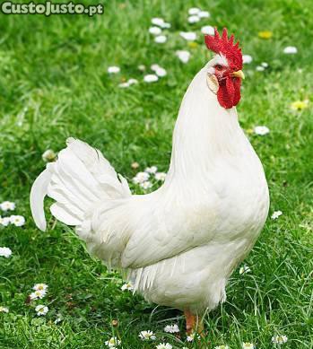 Galo branco novo criado à solta e alimentado todos os dias com fruta, verduras e misturas de sementes.