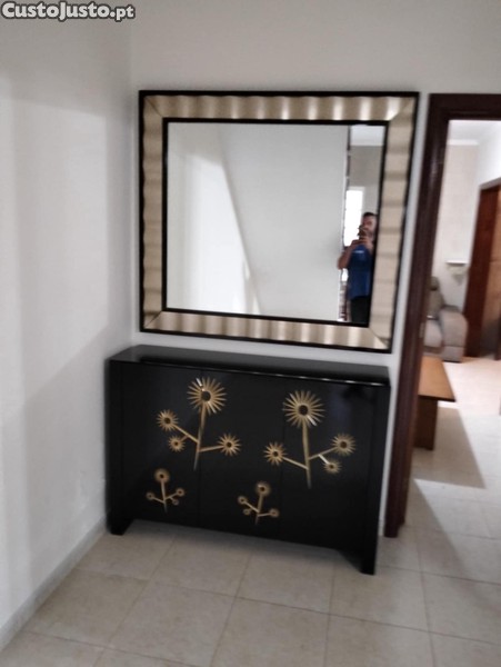 Móvel lacado preto e dourado e espelho dourado