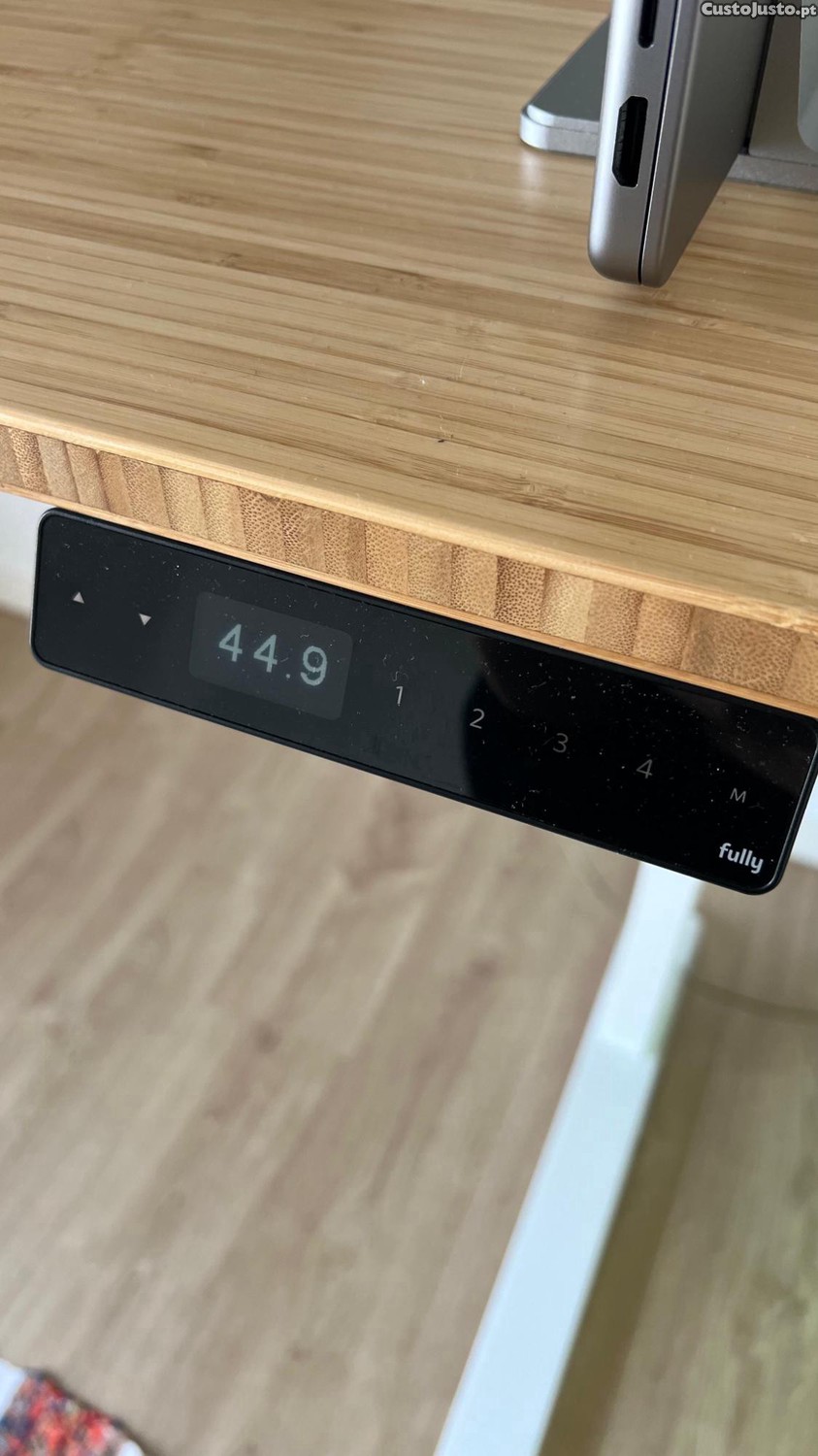 Secretária topo de gama, ajustável em altura e tem todos os extras incluídos, tomada e entradas USB no tampo e bolsa de metal para arrumação dos cabos.
