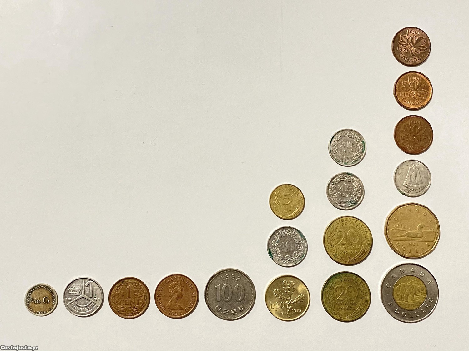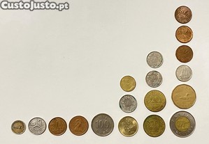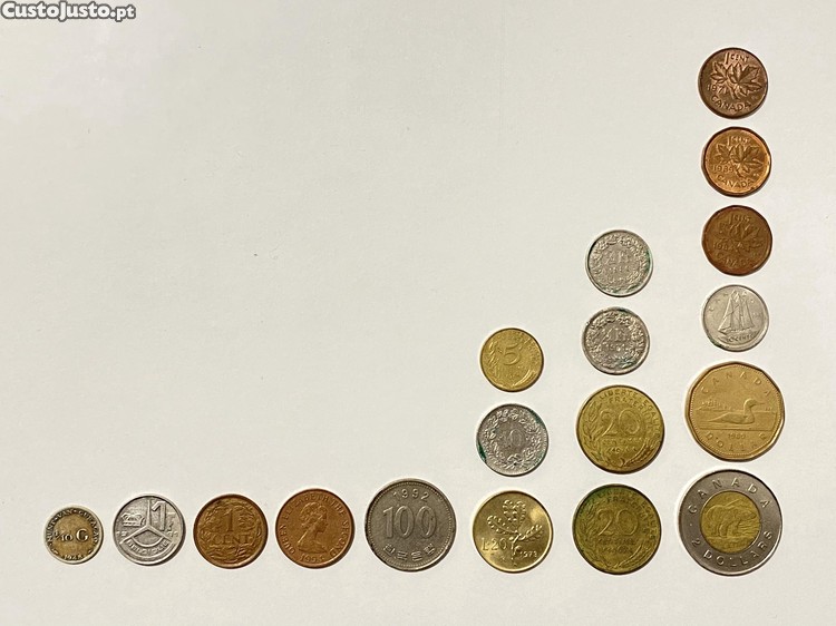Conjunto de moedas estrangeiras, circuladas, em bom estado (não obstante as marcas do tempo) e em condições originais, sem intervenção de limpeza.