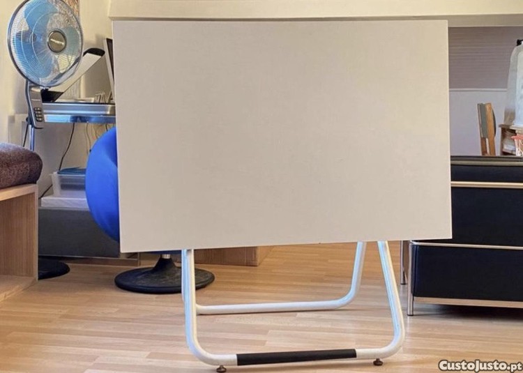 Estrutura em aço tubular, lacado a branco, com articulações que permitem diferentes ângulos e alturas ao tampo, bem como a inclinação do estirador que pode ser fechado na totalidade.