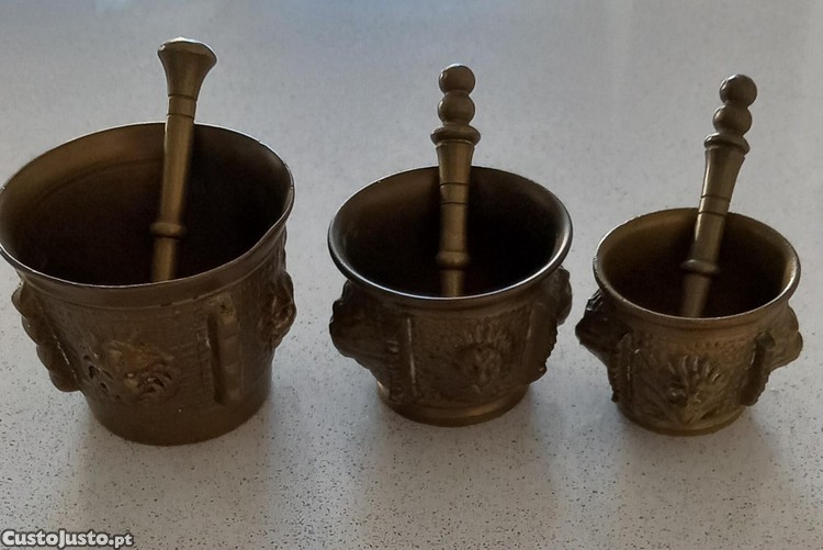 3 pequenos almofarizes de bronze, antigos, com respetivo pilão.