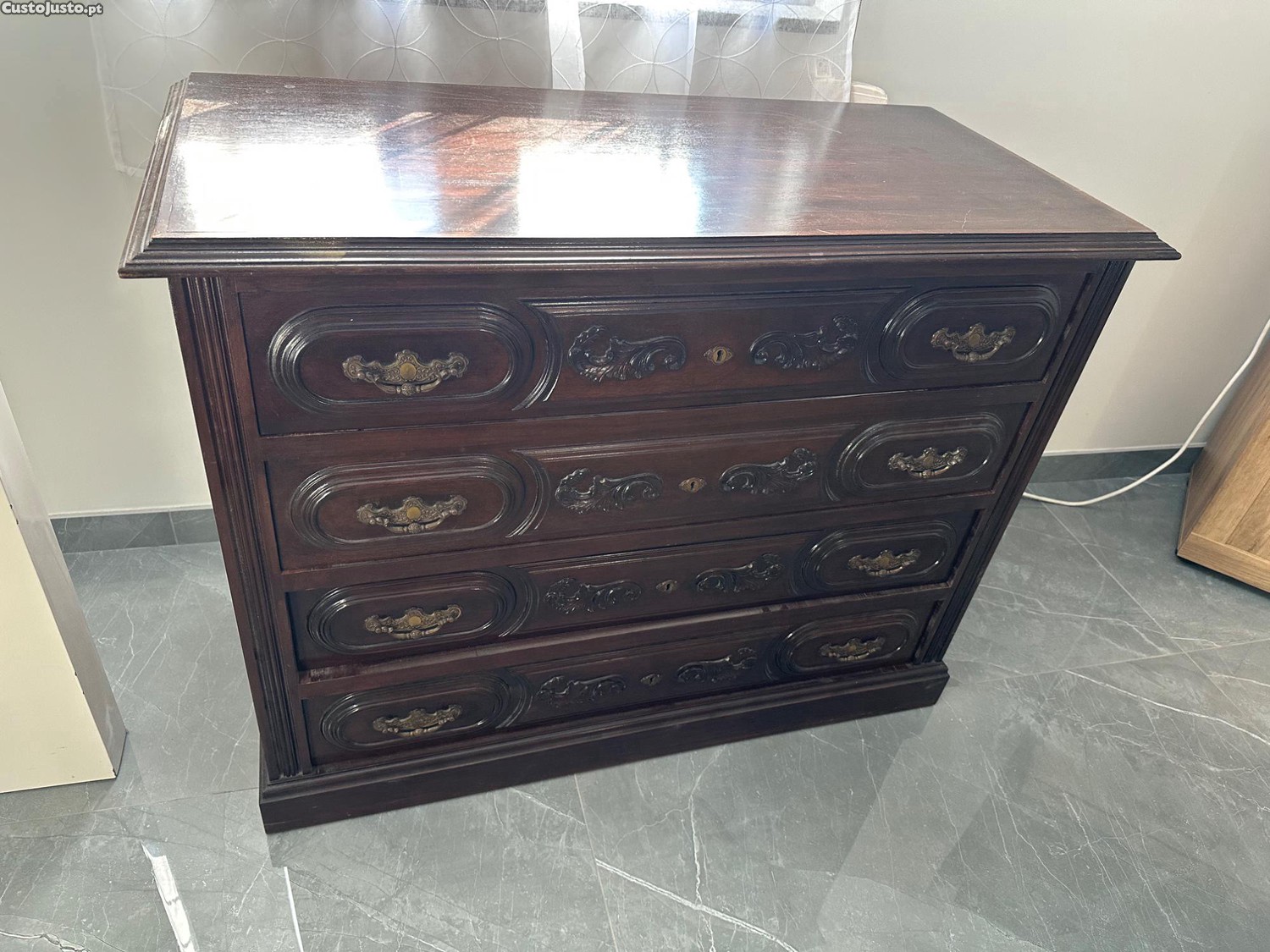 Este móvel antigo de madeira escura com detalhes decorativos é um excelente complemento para qualquer ambiente. Com seus 4 gavetas, oferece espaço de armazenamento prático. Apesar de usado, encontra-se em bom estado de conservação, mantendo seu charme e elegância característicos