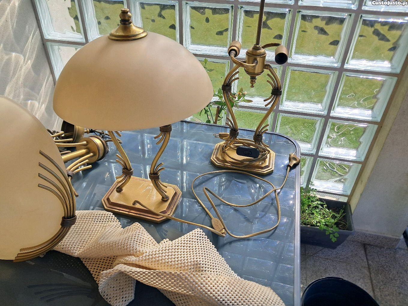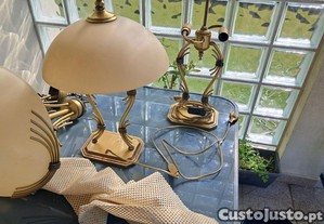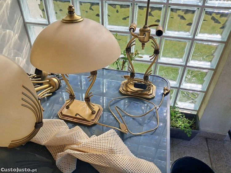 Conjunto 4 candeeiros de quarto, com estrutura em latão e abajures em vidro fosco. Peças com sinais de uso, mas em bom estado geral. Ideal para dar um toque vintage ao seu quarto de dormir. 2 candeeiros de teto e 2 de cabeceira. Entrego em mãos zona Arrifana ou S. João da Madeira.