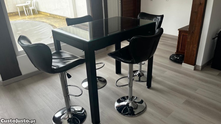 Conjunto de mesa com 4 bancos altos de madeira e vidro temperado.