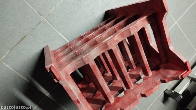Este é um suporte vermelho para garrafas de vinho, ideal para armazenar e exibir a sua coleção de vinhos em casa. Apesar de usado, o suporte encontra-se em bom estado de conservação e é uma opção prática e económica para criar a sua adega pessoal.