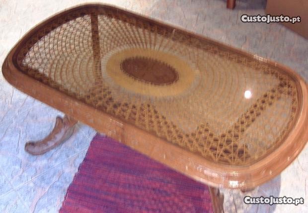 vendo mesa em madeira com tampo de vidro e vime por baixo.