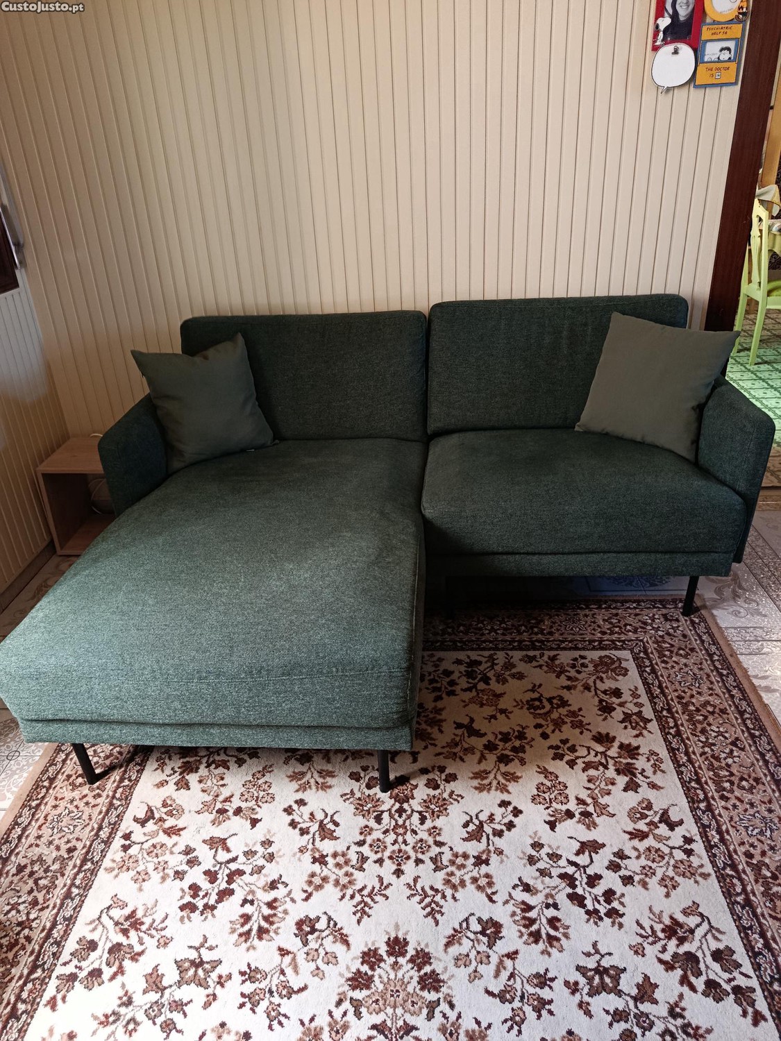 Sofá de canto com 2 lugares da marca Beliani na cor verde escuro em tecido e pernas de metal, com pouco tempo de uso.