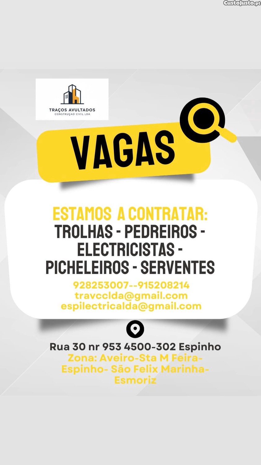 Estamos a Contratar para a zona de Vn Gaia, Sao felix da marinha, Espinho, Esmoriz, Anta e Sta Maria da Feira.