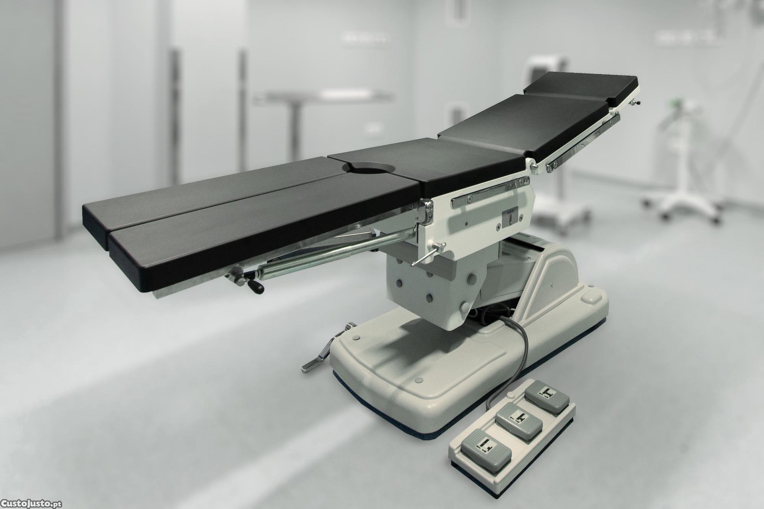 Pedal elétrico de controlo incluído para ajuste das posições da mesa. Inclui ainda todos os cabos de alimentação necessários ao funcionamento. Compatível com acessórios padrão para mesas cirúrgicas (não incluídos), como suportes de membros, extensões de mesa e acessórios de posicionamento. Não tem módulos adicionais ou funcionalidades opcionais instaladas pelo fabricante fora da versão padrão. Equipamento conforme configuração original de fábrica.