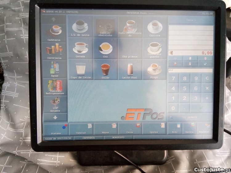 POS touchscreen com impressora, gaveta de dinheiro e software ETPos versão 4.20.1, com licença vitalícia e de acordo com a actual legislação. Material como novo, com muito pouco uso e com factura, obviamente. O software está programado para a restauração, mas pode ser usado para qualquer tipo de negócio