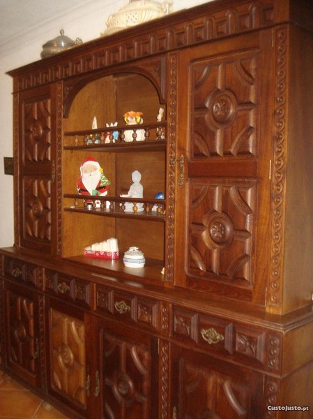armário em madeira rústica muito pesada todo trabalhado e em bom estado de conservação, com duas portas em cima, cada uma com três prateleiras e quatro portas em baixo ,cada uma com duas prateleiras.Quatro gavetas.