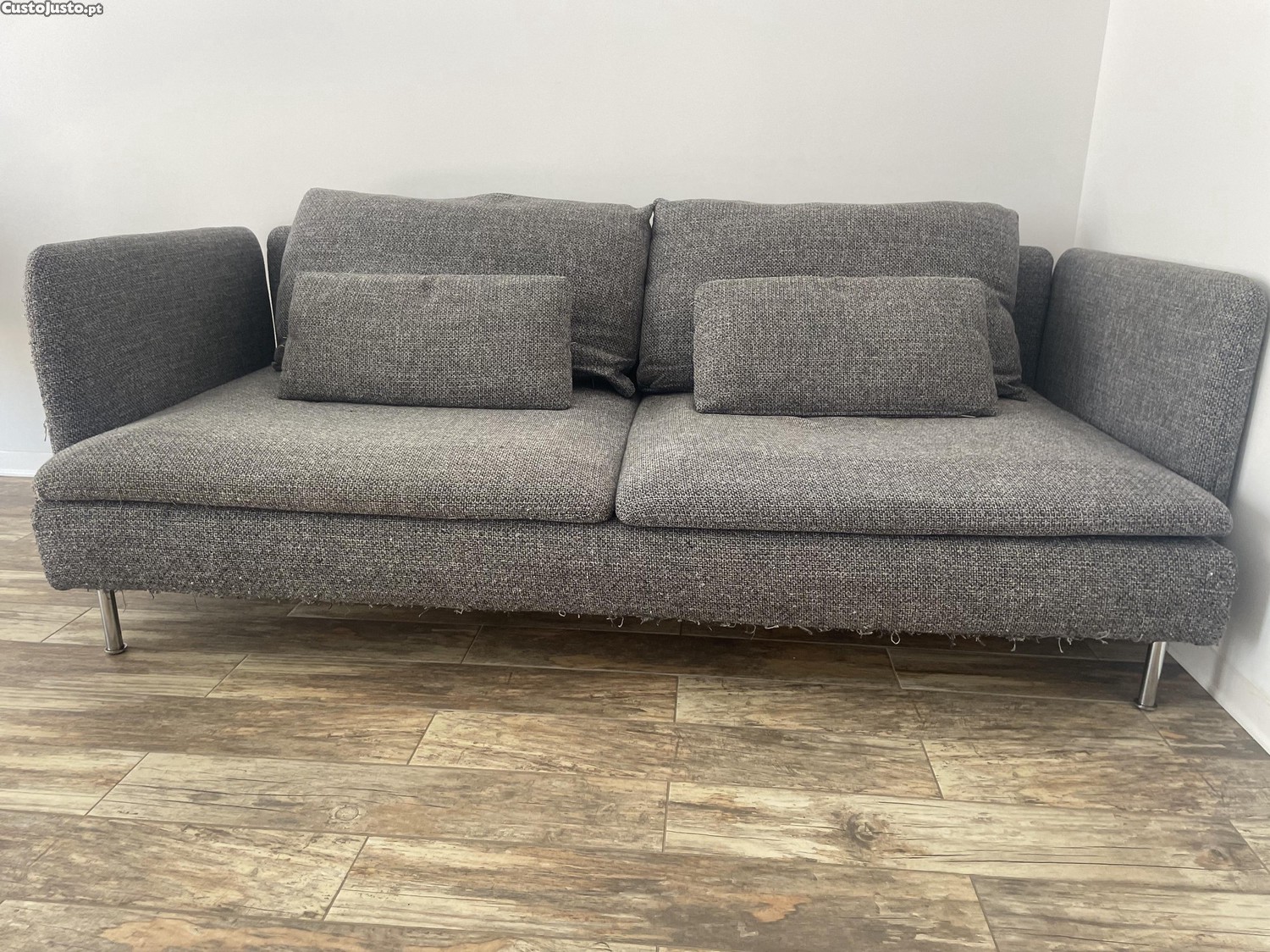 Apesar dos sinais de uso e dos arranhões, o sofá mantém-se confortável, funcional e com muito para oferecer.