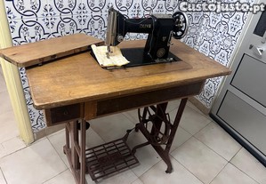 A máquina encontra-se montada no móvel original em madeira, com pedal e estrutura em ferro fundido. Mantém os detalhes originais, incluindo logótipos e mecanismos. Sistema de funcionamento por pedal (não elétrica), muito resistente e durável.
