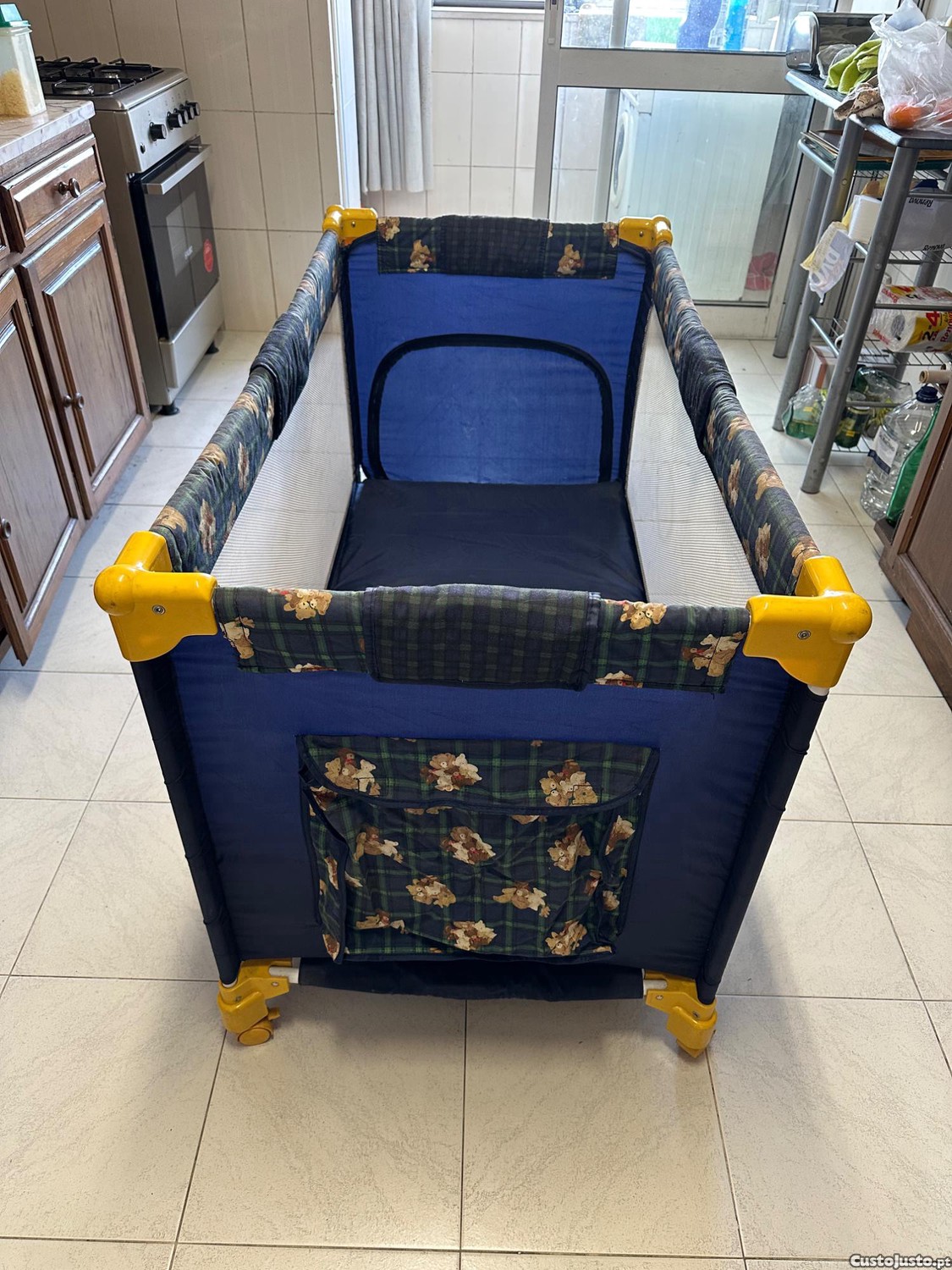 Cama de viagem para bebé e criança pequena, usada, em bom estado. Completamente funcional. Com uma abertura com fecho num dos topos que permite à criança entrar e sair.