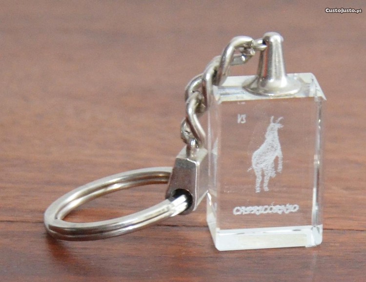 Porta-chaves com prisma em cristal em cujo interior está gravado, em imagem 3D, o símbolo do signo Capricórnio. Trata-se de um produto alemão de elevada qualidade, não uma das muitas imitações que pululam no mercado.