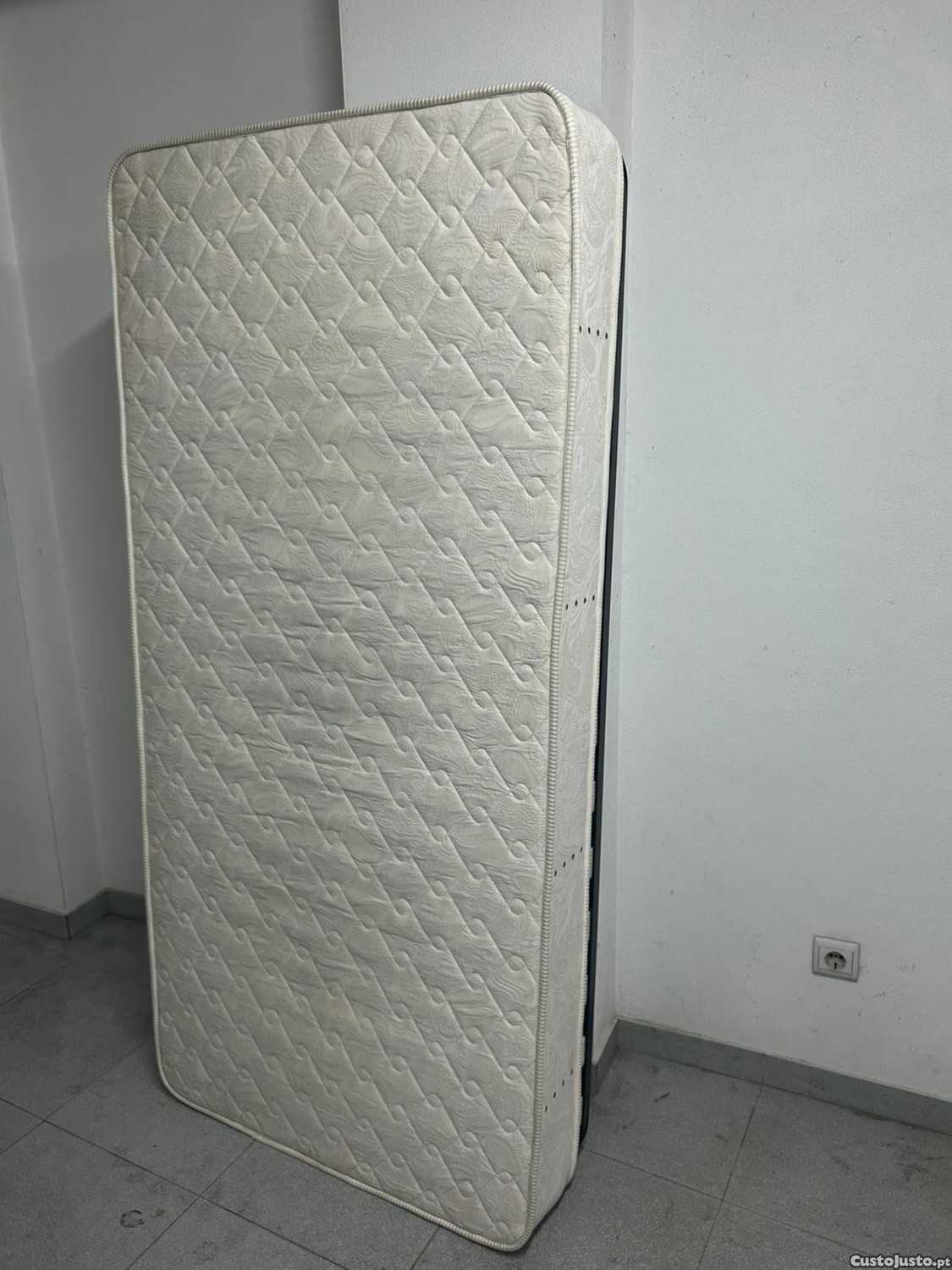 Colchão de solteiro com estrado em bom estado de conservação, com dimensões de 190x90 cm. Ideal para quem procura uma opção económica e prática para o seu quarto.