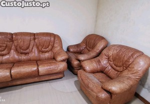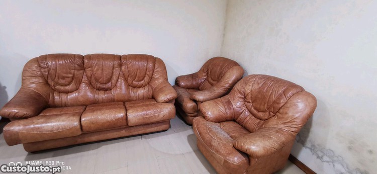 Conjunto de sofás de couro usado, com design clássico e confortável. Ideal para uma sala de estar.