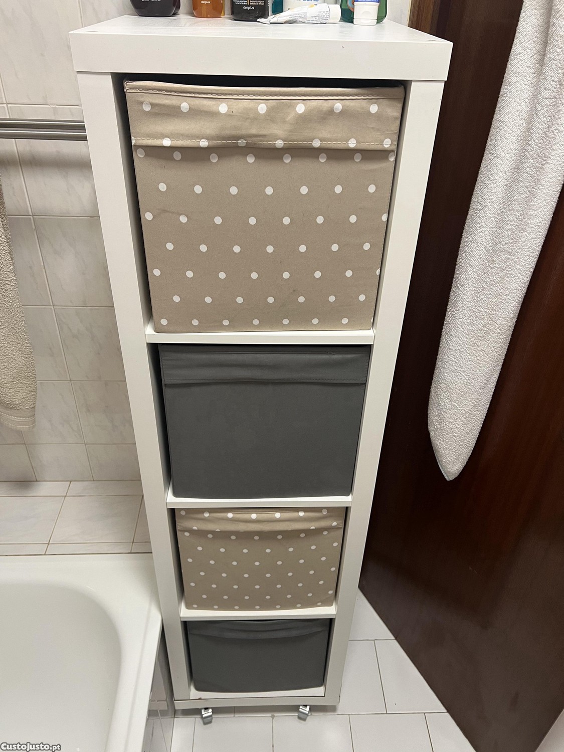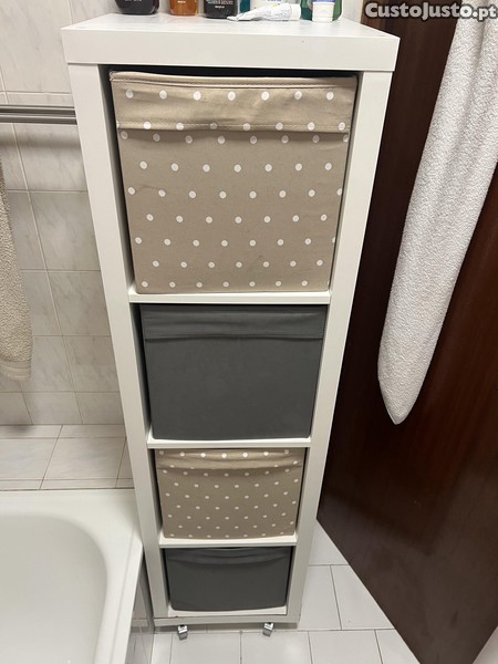 Vendo está estante com caixas e as rodas. Coloquei rodas como dá para ver utilizei para por na casa de banho, para poder mover facilmente. Mas está estante agora ocupa-me muito espaço nesta casa de banho porque está a trás da porta. Entrego só em Braga e é preço negociável.