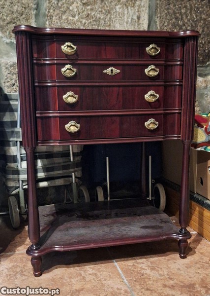 Móvel antigo com design clássico. Estrutura sólida e acabamento em tom escuro, com detalhes decorativos em metal dourado.