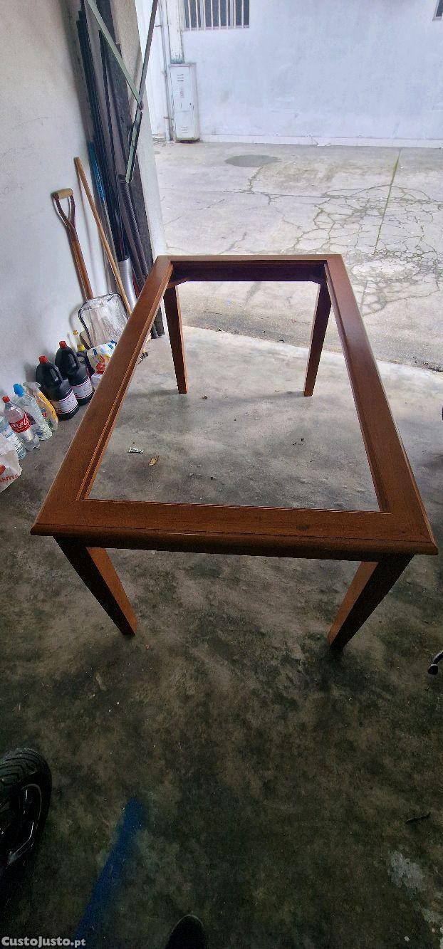 Mesa de madeira, nogueira, com vidro rochedo translúcido.