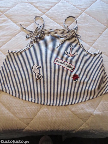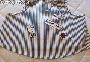 Padrão às riscas azul e branco com detalhes bordados/aplicações (âncora, cavalo-marinho, flor e smooth sailing ), que dão um toque divertido e estilo náutico