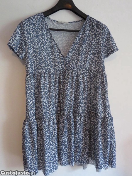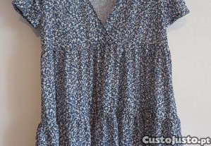 Super leve e confortável, perfeito para o dia a dia ou para um look mais descontraído. Tem um padrão floral delicado em tons de azul e branco, com decote em V.
