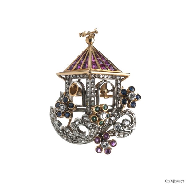 Alfinete Torre da Igreja, português, ouro de 19,2kt e platina de 500%, cravejado com rubis, safiras, esmeraldas e diamantes talhe rosa, 8/8 c. de 0,39 ct, com contraste cavalo, galo em uso desde 1938/1984.