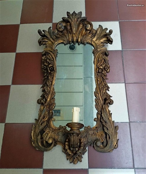 Aplique de parede com espelho em talha dourada.