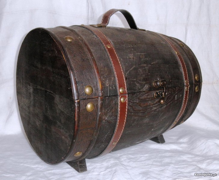 Caixa de madeira em forma de barril.