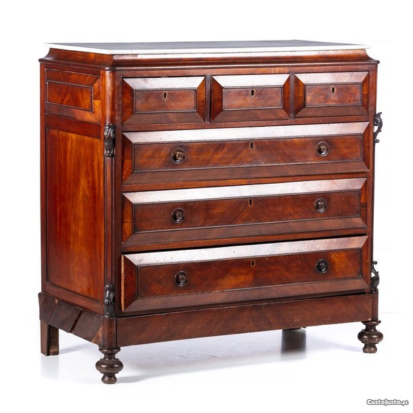 Cómoda romântica, portuguesa do século XIX, em madeira de mogno e tampo em mármore.