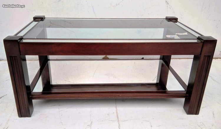 Bela e prática mesa de centro espelhada em madeira e vidro.