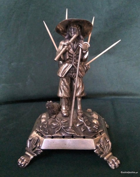 Paliteiro de prata representando pastor tocando flauta, contraste Águia.