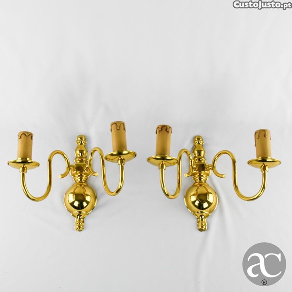 Com desenho ornamental de gosto clássico. Cada peça apresenta uma rosácea/placa central arredondada, de onde partem dois braços em curva que sustentam as bases dos casquilhos. A composição é equilibrada e elegante, com volumes torneados e superfície polida, pensada para decoração de interiores com um ar tradicional.
