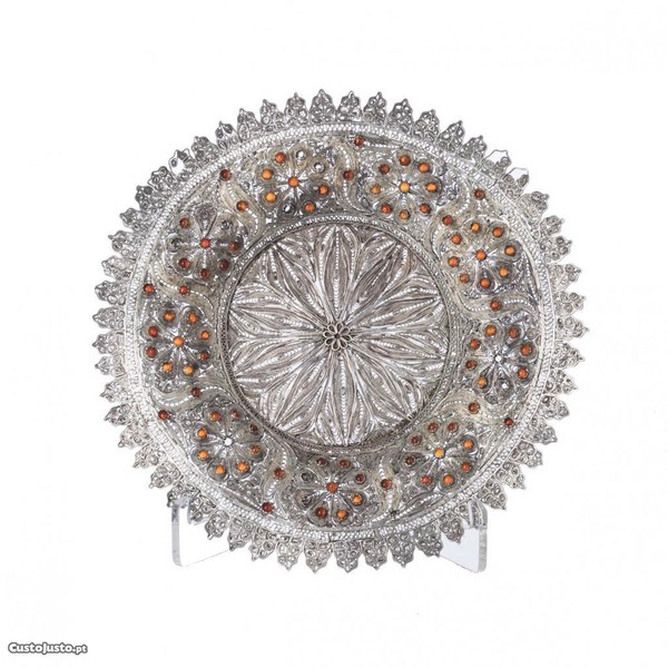 Salva indo-portuguesa do século XVII/XVIII em prata filigranada com aplicação de granadas em talhe cabochão, Sem marcas.