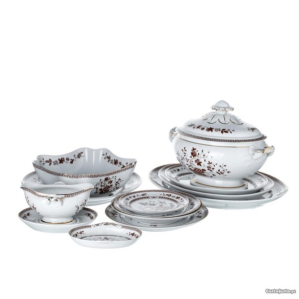 Composto por 24 pratos rasos, 12 pratos de sopa, 12 pratos de sobremesa e 12 pratos de doce, terrina, molheira com travessa, saladeira, 3 travessas de diferentes tamanhos, 2 azeitoneiras, 2 pratos de bolo.