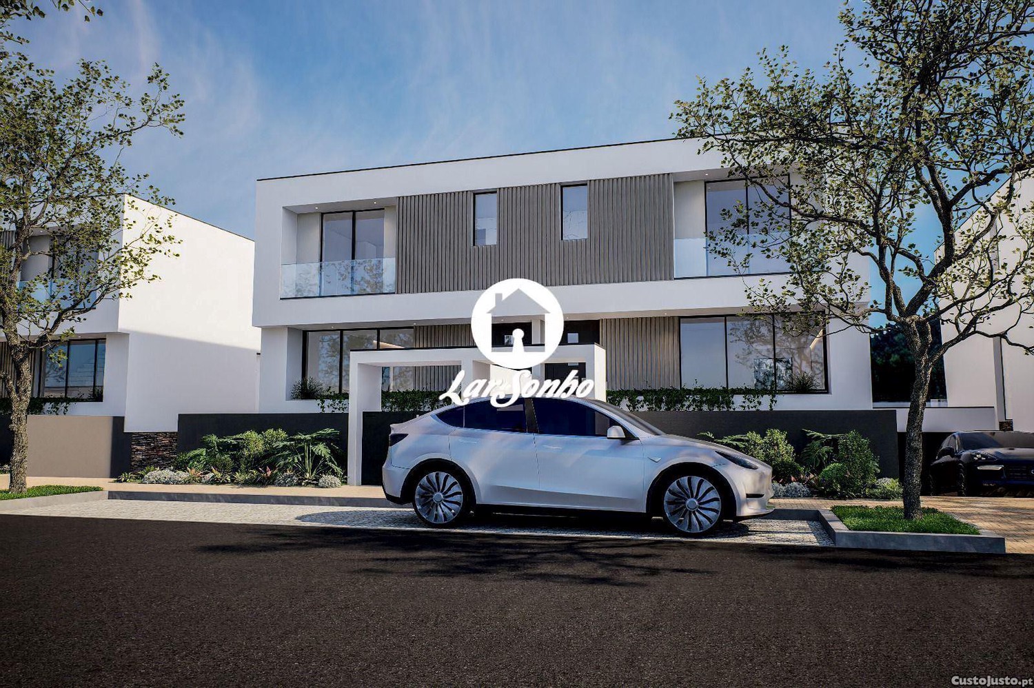 A garagem fechada para três viaturas, complementada por uma prática zona de lavandaria, alia comodidade e organização ao quotidiano.