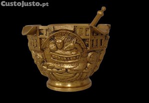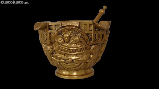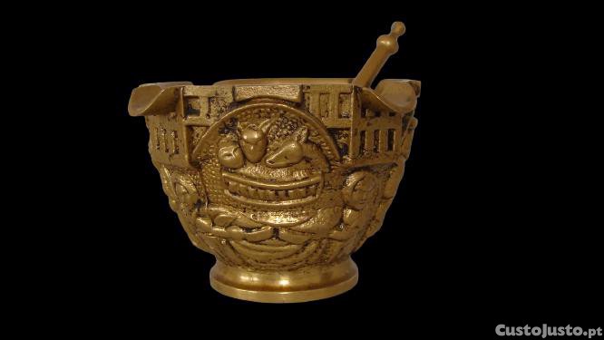 Antigo almofariz com pilão de bronze religioso