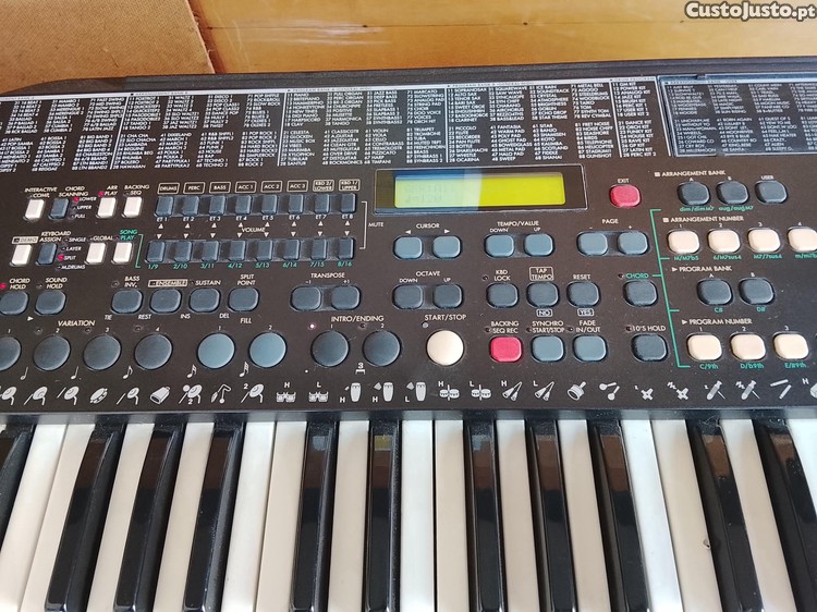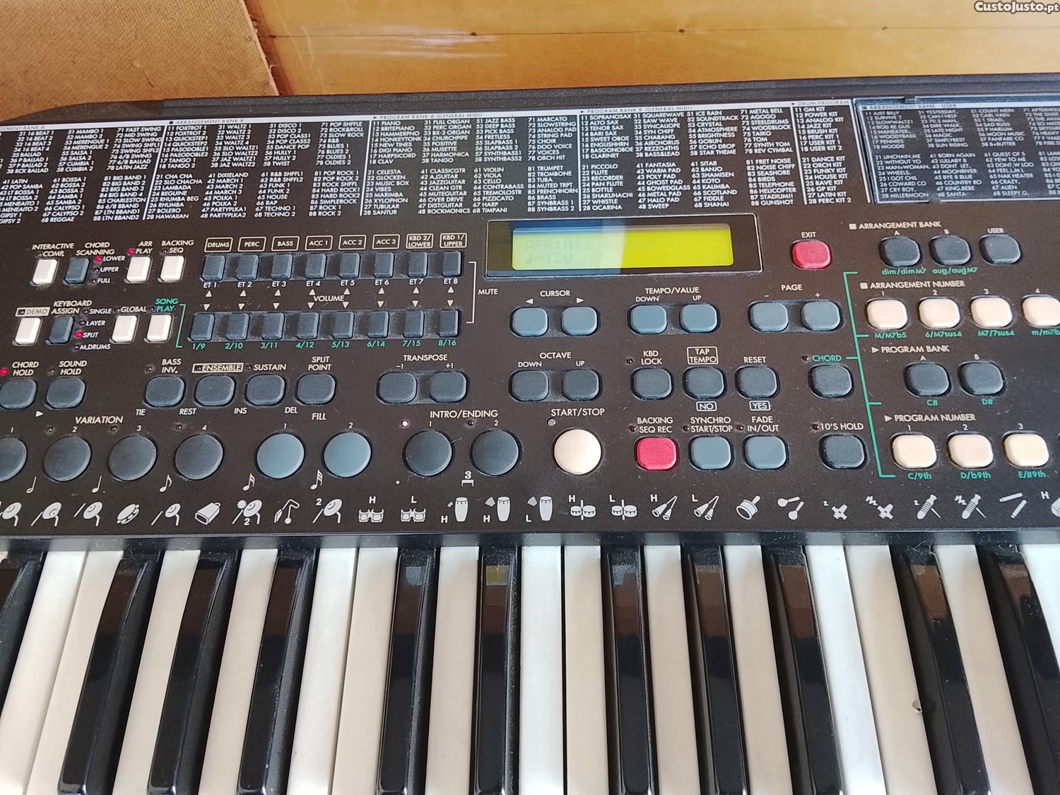 Teclado 100% funcional com muitos sons internos de todos os géneros desde Valsa, tango,blues, pasodoble,rumba etc. Sons de acordeon,piano,sax,clarinete, oboé etc.
