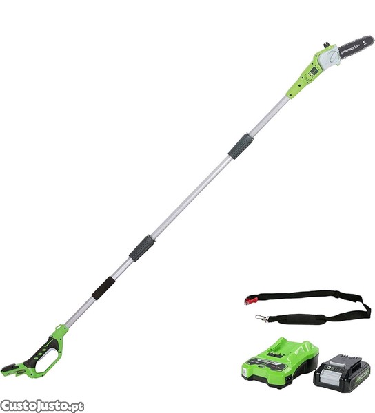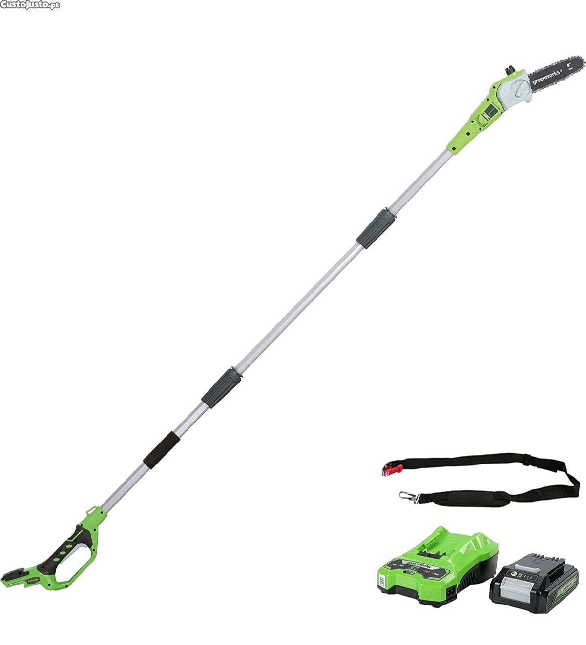 barra de 8 polegadas (20 cm), velocidade de corrente de 6,7 m/s, 3,2 kg, auto-lubrificado, alcance de poste de 2,6 m, bateria 24 V 2 Ah