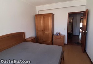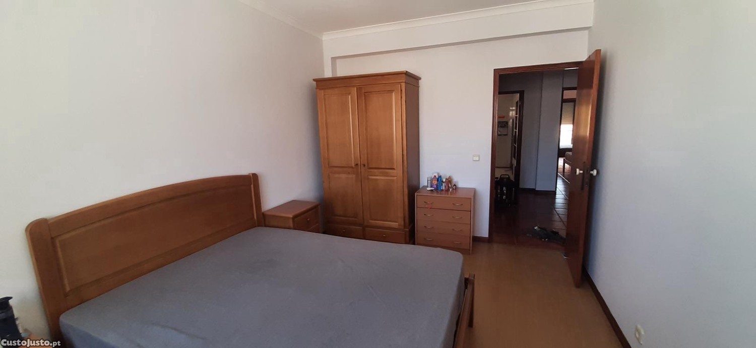 Quarto mobilado com cama de casal, armário, mesinha de cabeceira e secretária.