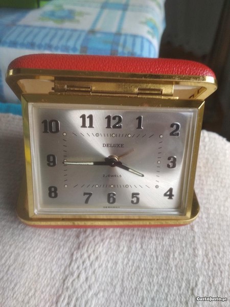Antigo relógio despertador de viagem da marca DELUXE, fabricado na Alemanha, movimento de corda, caixa em metal dourado, estojo vermelho, em excelente estado de conservação e a funcionar perfeitamente. Mostrador e caixa de maior dimensão, retangular, modelo raro. Ótima peça de coleção.