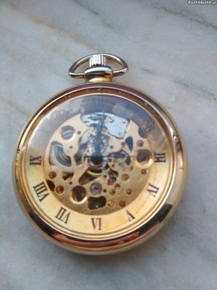 Relógio de bolso vintage, tipo esqueleto, mecânico sem marca, em funcionamento e em muito bom estado de conservação.