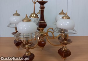 Candeeiro de teto, de 5 luzes, com elementos em loiça e traços a dourado.