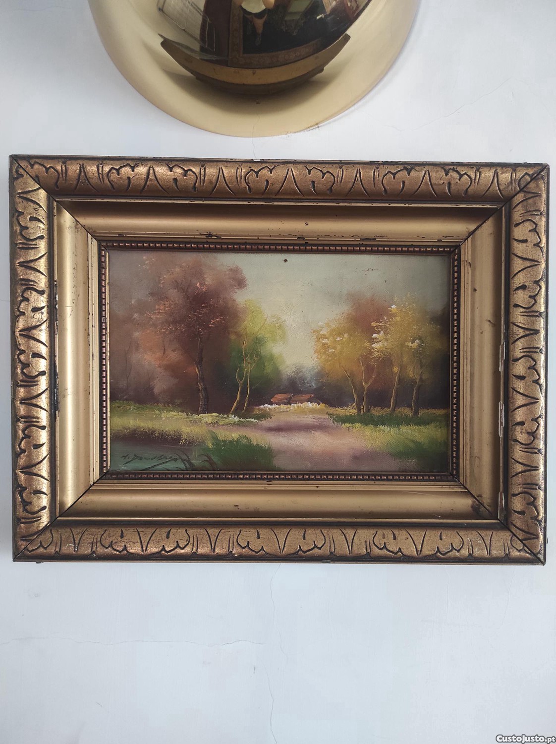Pintura original a óleo sobre tela, assinada por M. Douven. A obra retrata uma paisagem serena com árvores e um caminho.