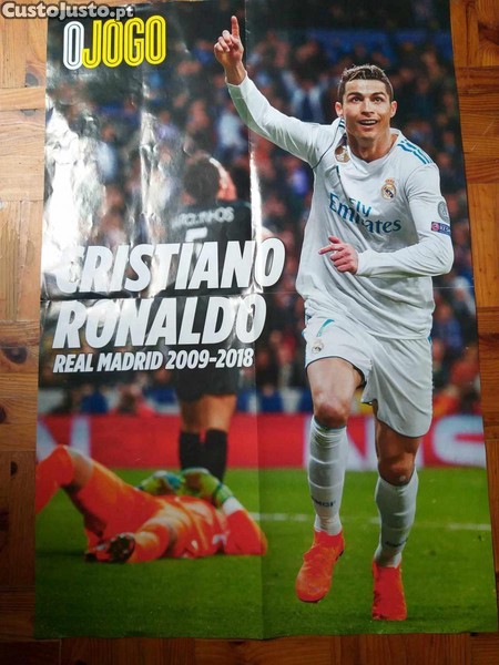 Poster em bom estado que tem a imagem de Ronaldo com a camisola do Real Madrid e no verso números da carreira de Cristiano Ronaldo até à data deste poster,
