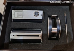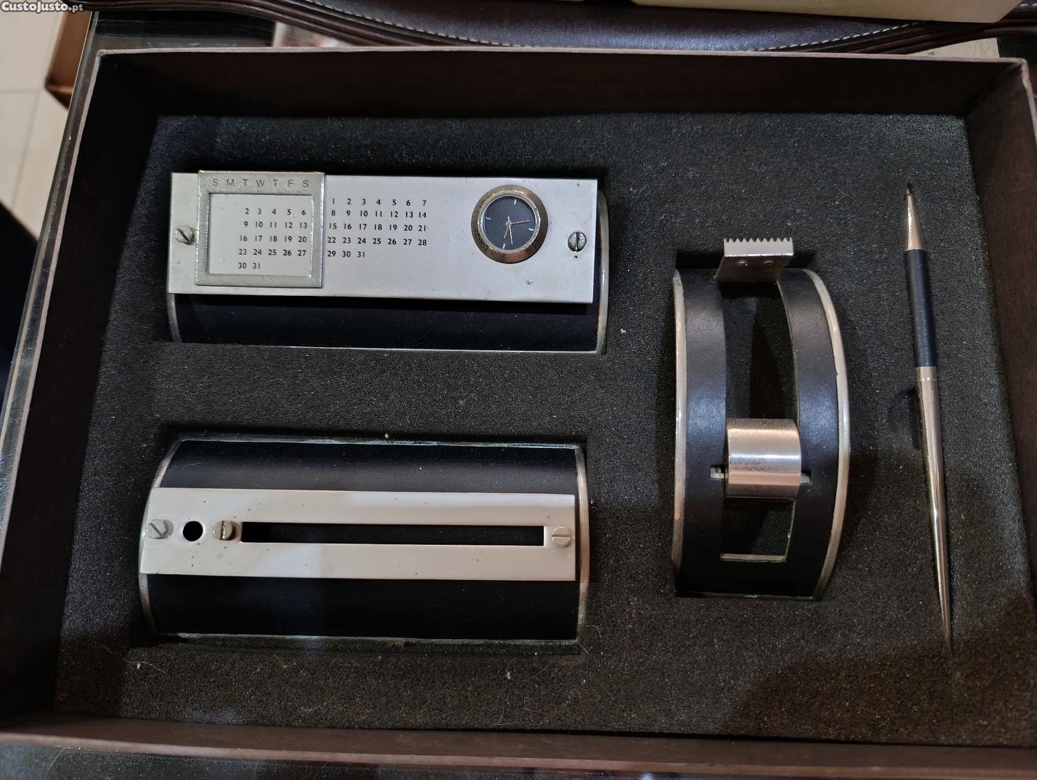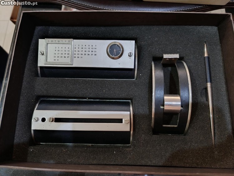 Inclui um calendário perpétuo manual com meses e dias da semana, possui um pequeno relógio analógico integrado, um suporte para fita-cola e uma caneta a condizer