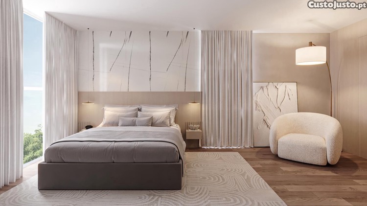 Cozinha equipada (placa, forno, exaustor, frigorífico e máquina de lavar loiça), pavimento vinílico de alta qualidade, caixilharia com vidro duplo e corte térmico estores elétricos, roupeiros embutidos, pré-instalação de ar condicionado, bomba de calor para águas quentes, pré-instalação de painéis solares, WCs modernos com base de duche, porta de segurança e vídeo porteiro.