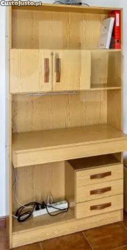 Prateleira de quarto com mesa de estudo em madeira, em bom estado de conservação. Possui compartimentos e gavetas para armazenamento. Ideal para organizar o seu espaço de trabalho em casa.