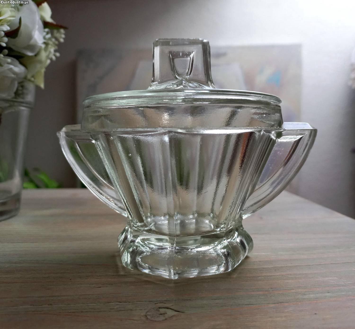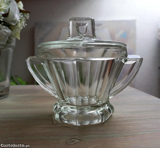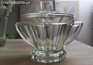 Lindíssimo Açucareiro ou Compoteira em vidro prensado ao estilo Art Déco, provavelmente Marinha Grande. Bom estado.